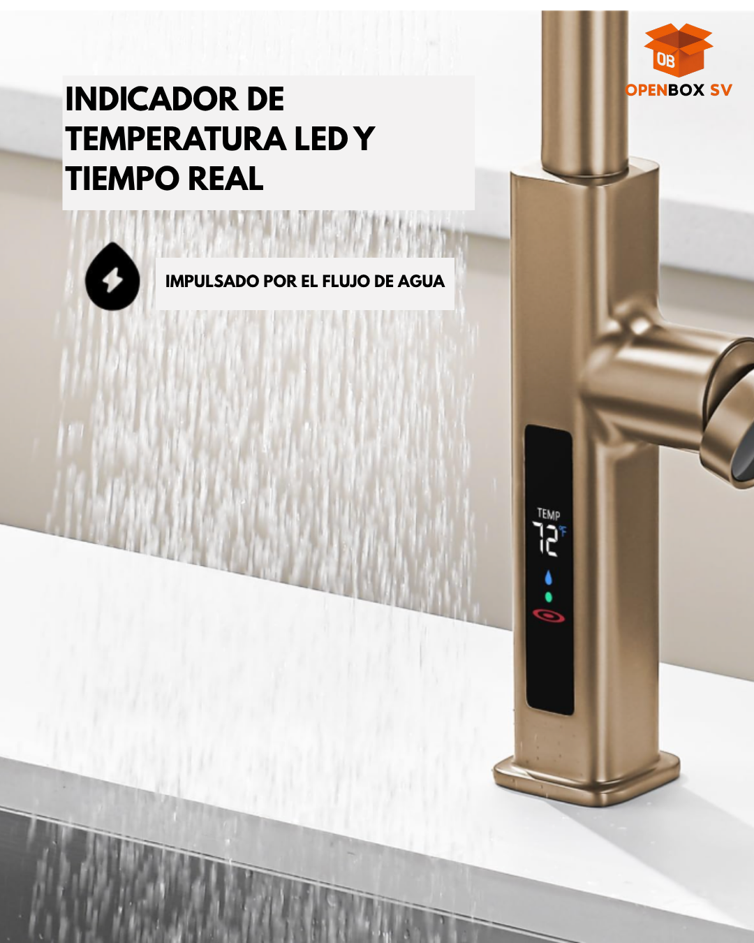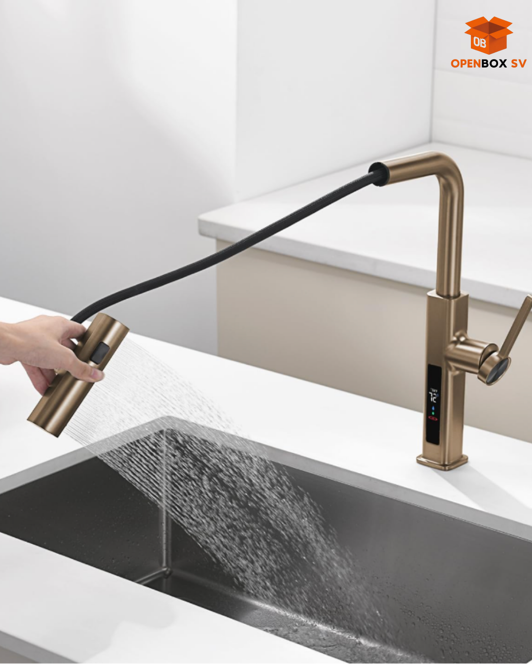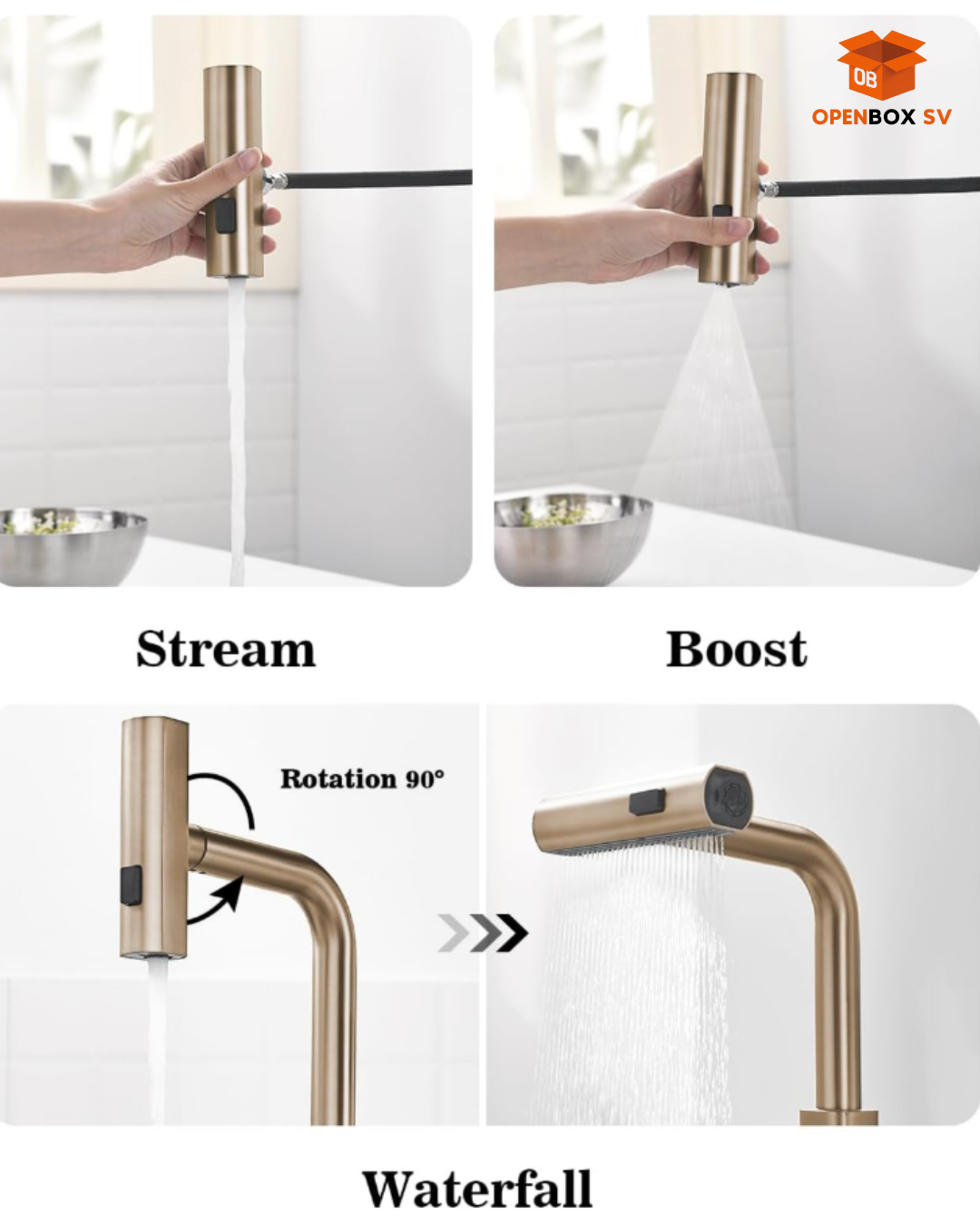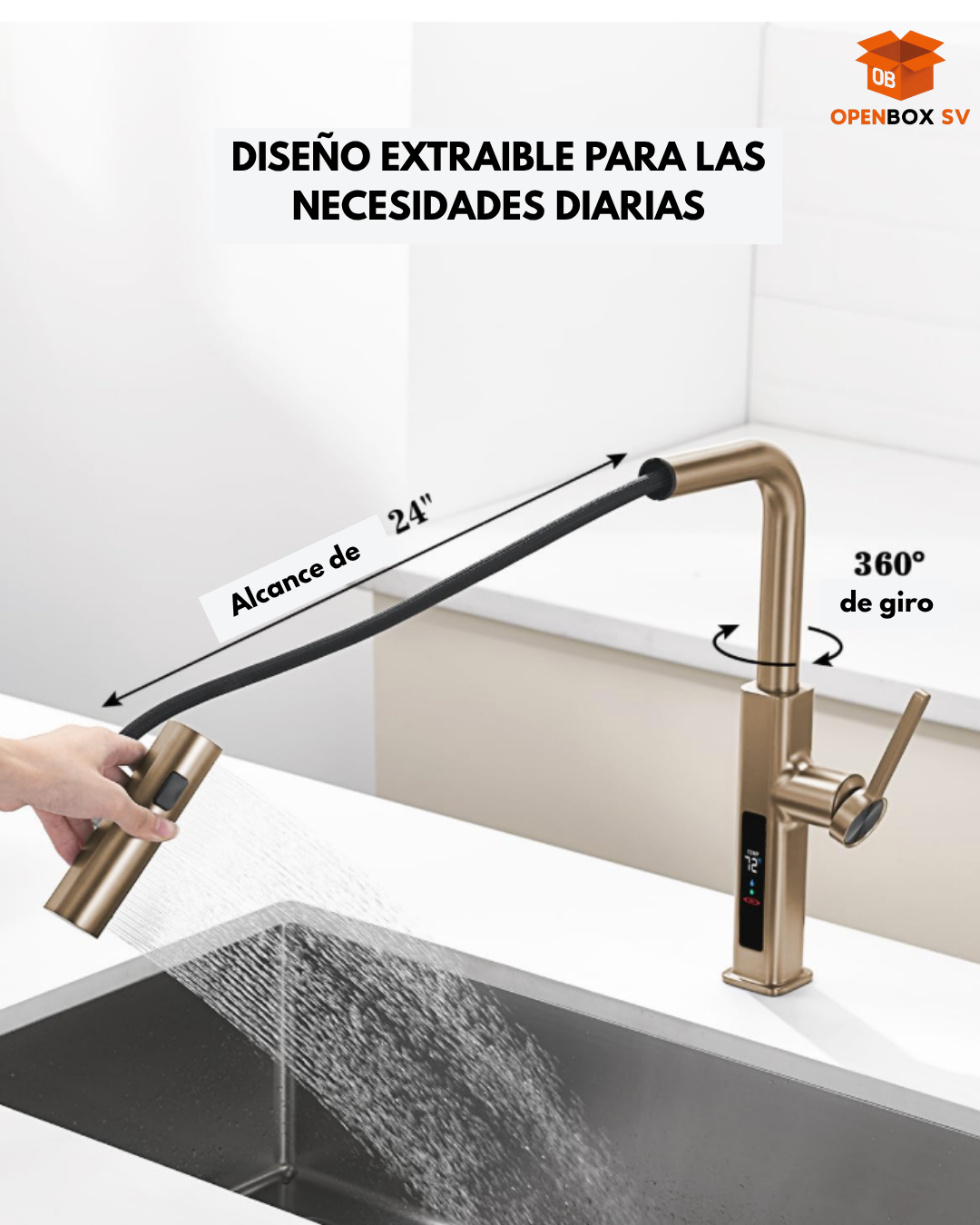 Chorro de cocina con cascada extraíble con pantalla de temperatura en Fahrenheit, 3 modos de salida de agua