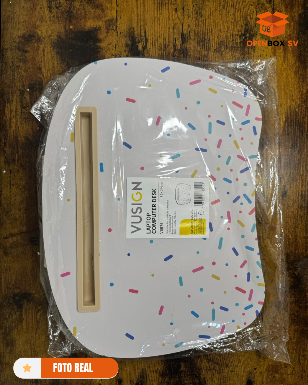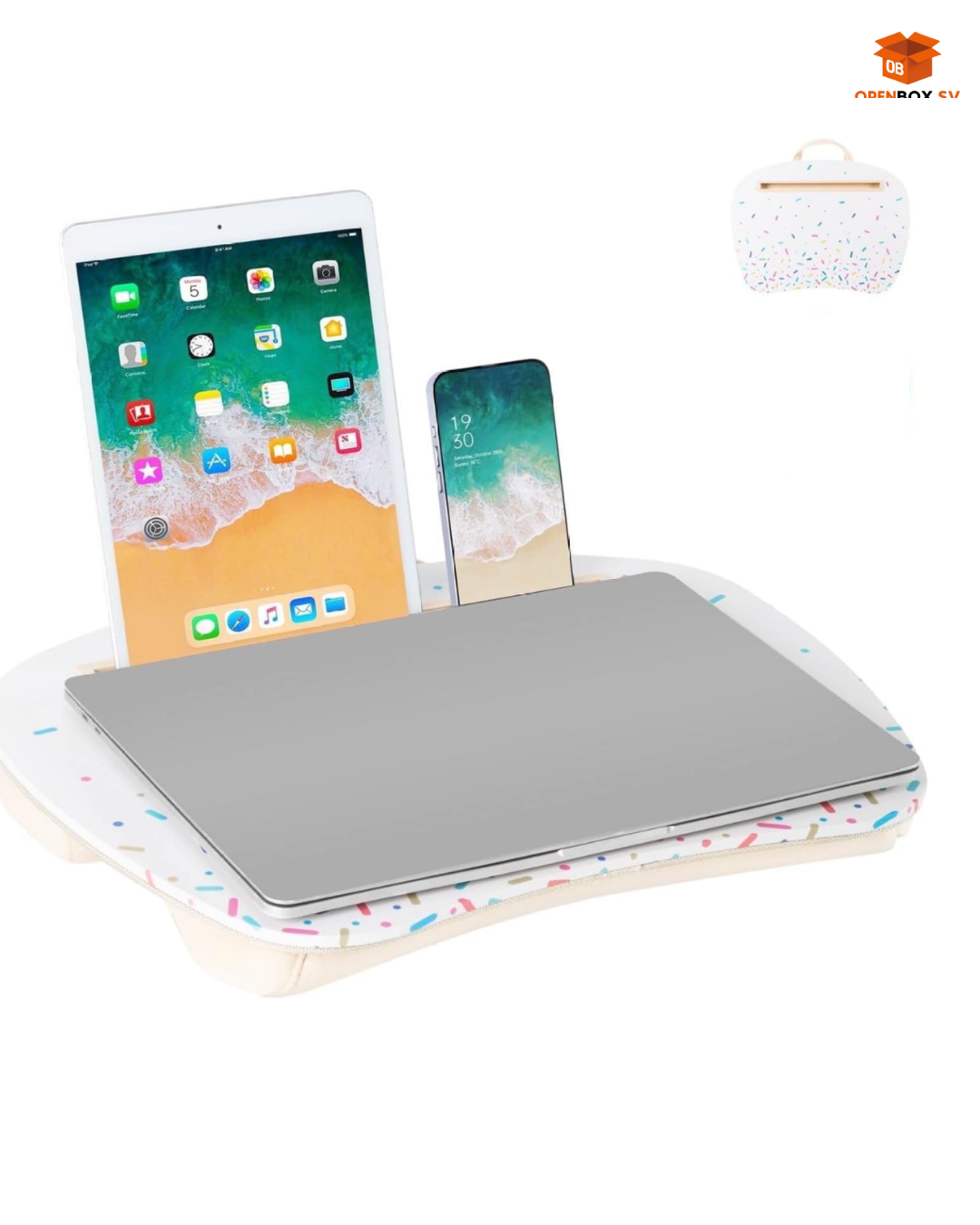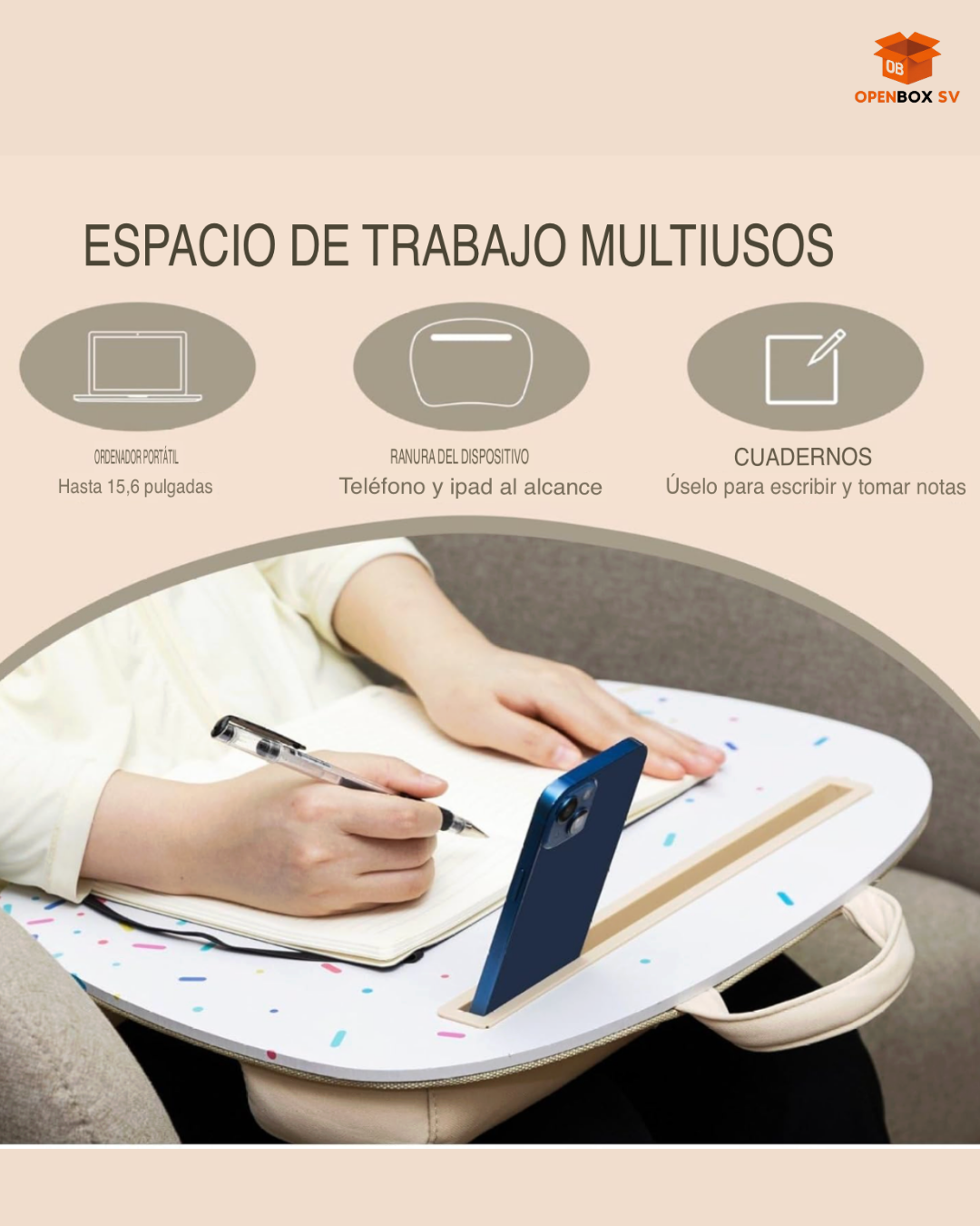 Con una superficie de 17.3” x 13.3”, esta mesa se adapta perfectamente a laptops de hasta 15.6”. Incluye una ranura integrada para tu celular o tablet, ¡todo al alcance de tu mano! 📱