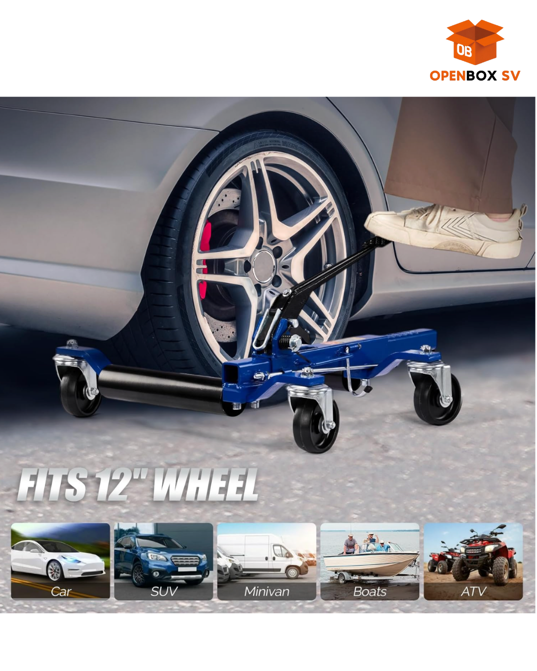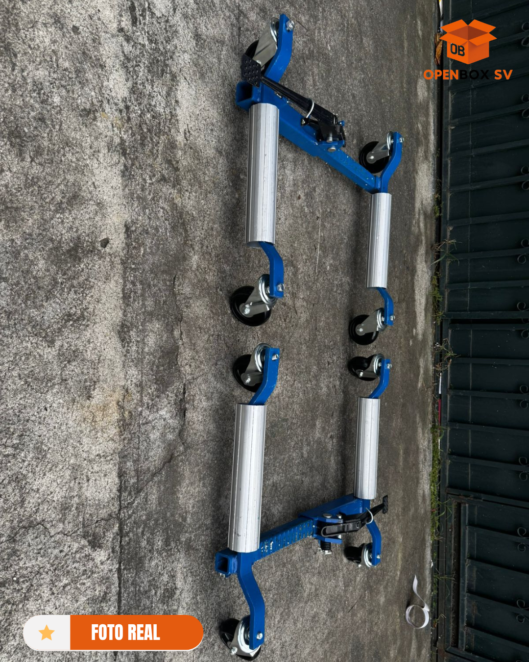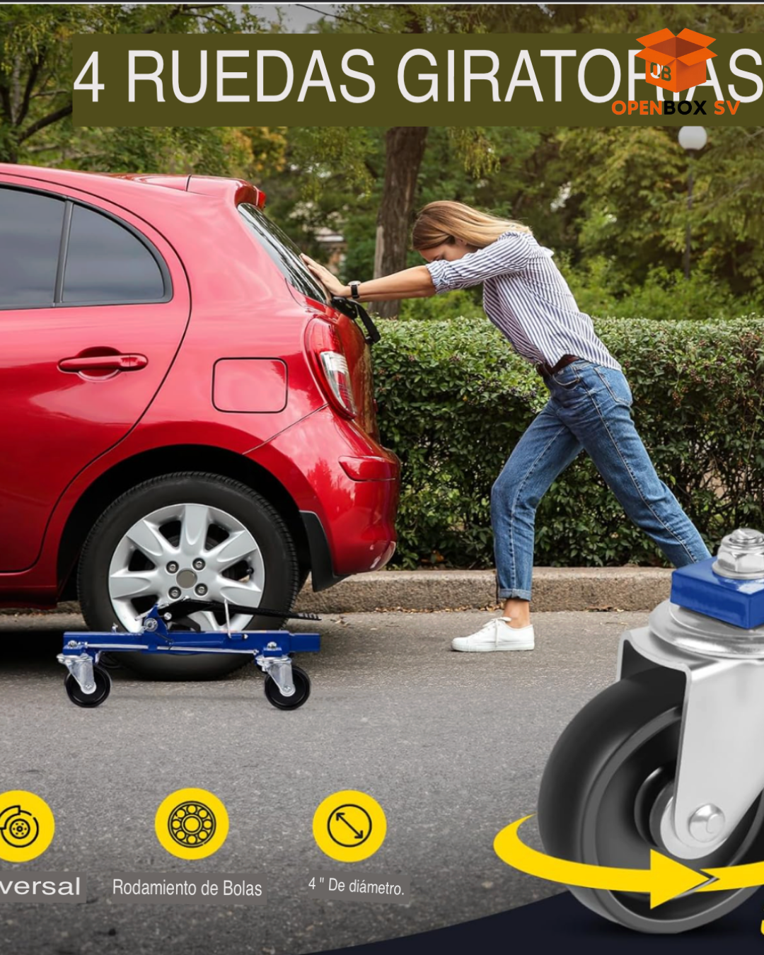 Equipado con ruedas giratorias de 4" con rodamientos de bolas, permite mover el vehículo suavemente en cualquier dirección, incluso girarlo en su propio eje. Una sola persona puede desplazar el vehículo por el garaje sin esfuerzo y sin dañar el piso.